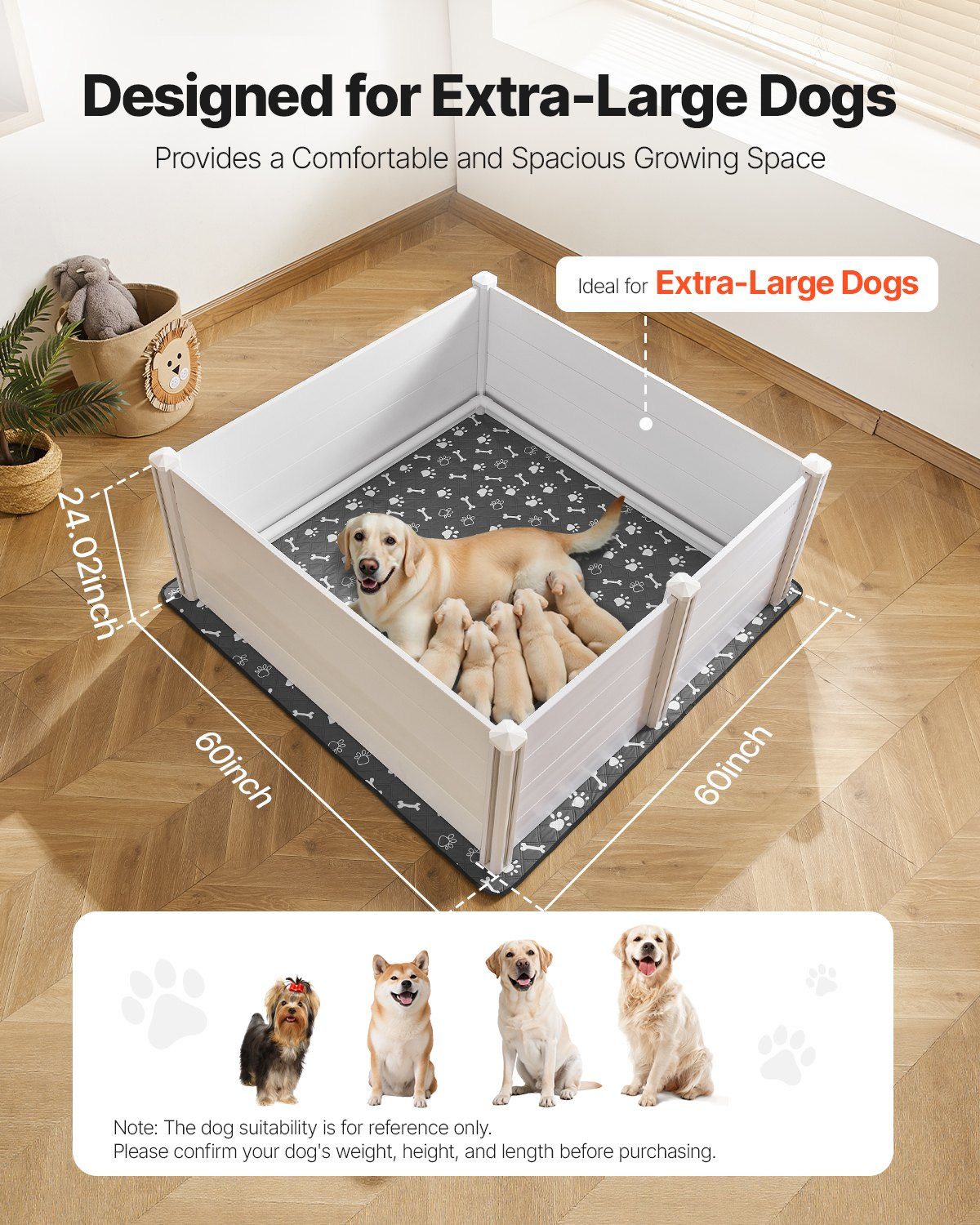 Give your extra-large breed mother dog and her growing litter the safe, spacious, and easy-to-care-for environment they need with this premium 60 x 60 x 24 Inch PVC Puppy Whelping Box Playpen. Designed specifically for big dogs, this versatile whelping box provides plenty of room for mom to move comfortably while keeping puppies secure during those important first weeks.Made from high-quality waterproof PVC, the entire box is strong, rustproof, and built to last through many litters. The smooth flat-panel design wipes clean in seconds with just a damp cloth, helping reduce bacteria and keeping the space fresh and hygienic.